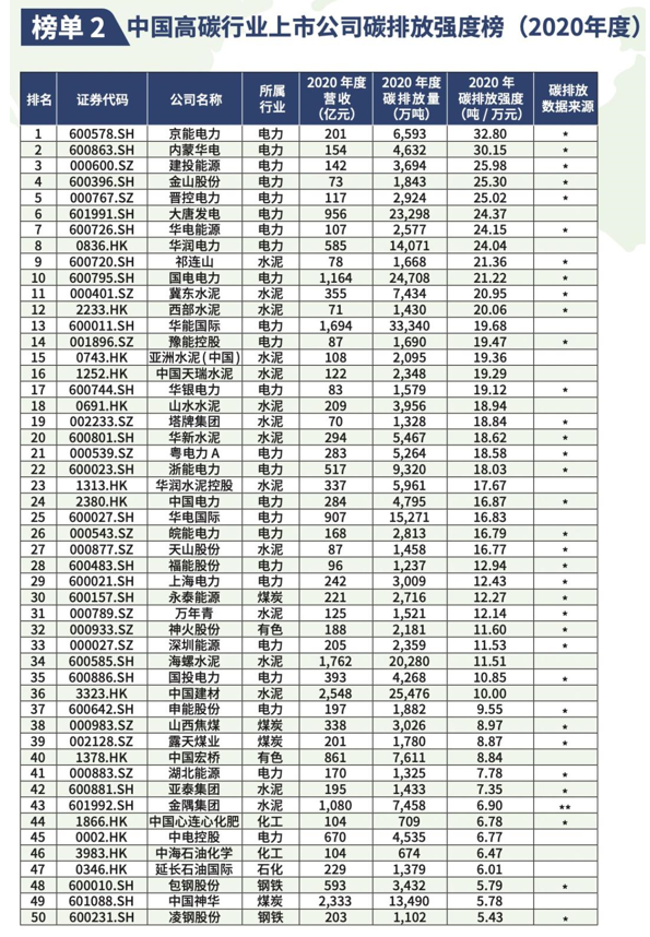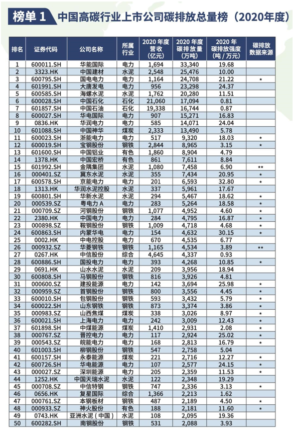 該榜單按照A股和港股上市的公司,在2020年直接或者間接排放的二氧化碳總量進行排序,以及公司每萬元營收產生的二氧化碳排放量進行排序;從這兩 個維度發布的總量和強度兩個榜單。