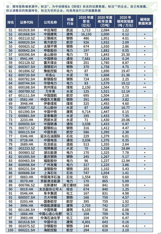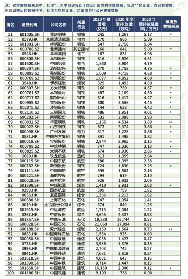在榜單中,石化、化工、建材、鋼鐵、有色、造紙、電力、航空為八大重點高耗能行業,涵蓋了在A股和港股上市的100家高碳排放公司。 值得注意的是,2020年度中國二氧化碳排放總量約為99億噸,而上榜的100家上市公司,二氧化碳排放總量合計44.24億噸,占全國總量約44.7%。可見這 100家上市公司在中國碳排放總量的比重非常高,強度也是很大。