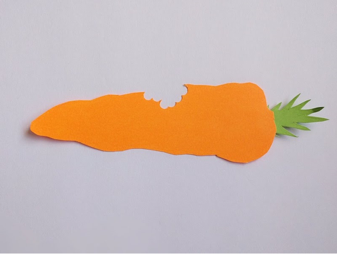 第二步,下載我們的模板圖,或者直接用橙色卡紙與綠色卡紙裁剪一個蘿卜與葉子的形狀,并將蘿卜和葉子粘在一起。最后在蘿卜中心位置(如圖)裁剪一個兔牙咬的形狀。