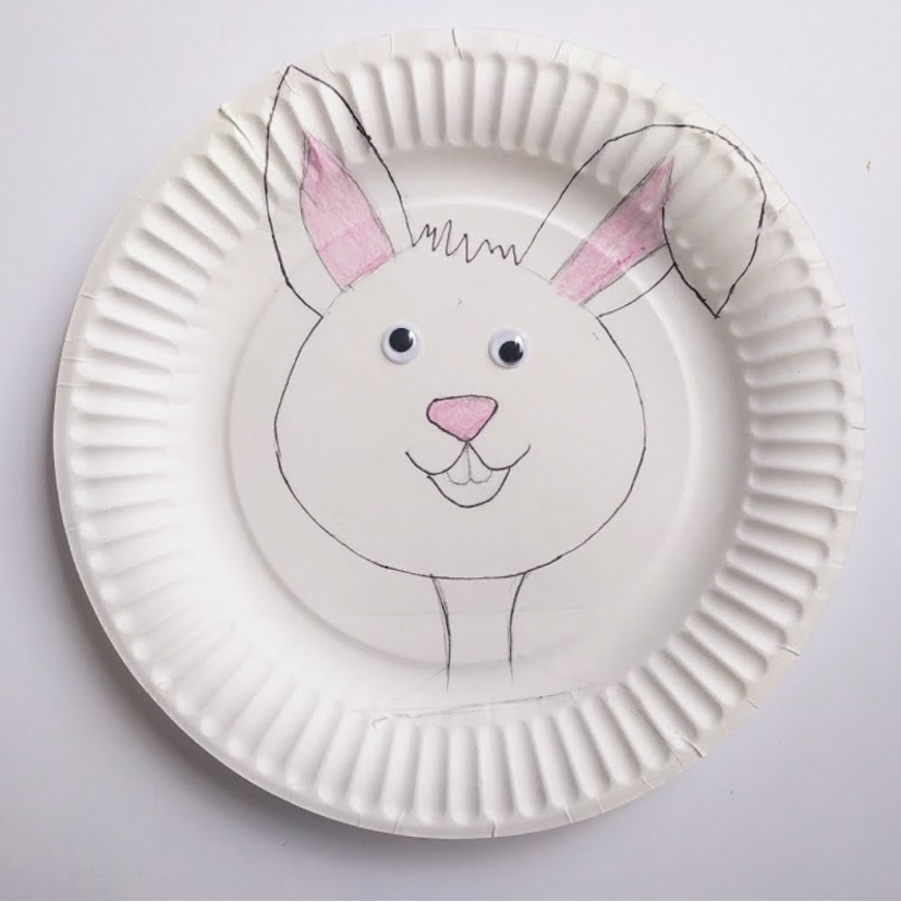 第五步,把兔兔眼睛用雙面膠粘在盤子上;然后用粉色蠟筆涂鴉如圖位置。